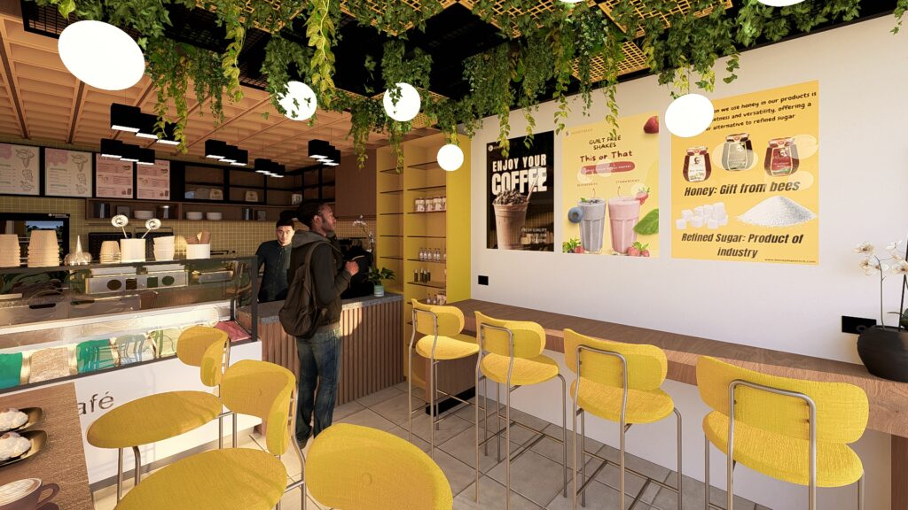 Cafe HONEYMAN is a revolutionary concept in dessert retail, introducing the world’s first honey-based ice cream outlet. Designed to promote health without compromising on indulgence, this container-style café is a bold step in sustainable architecture and innovative branding.